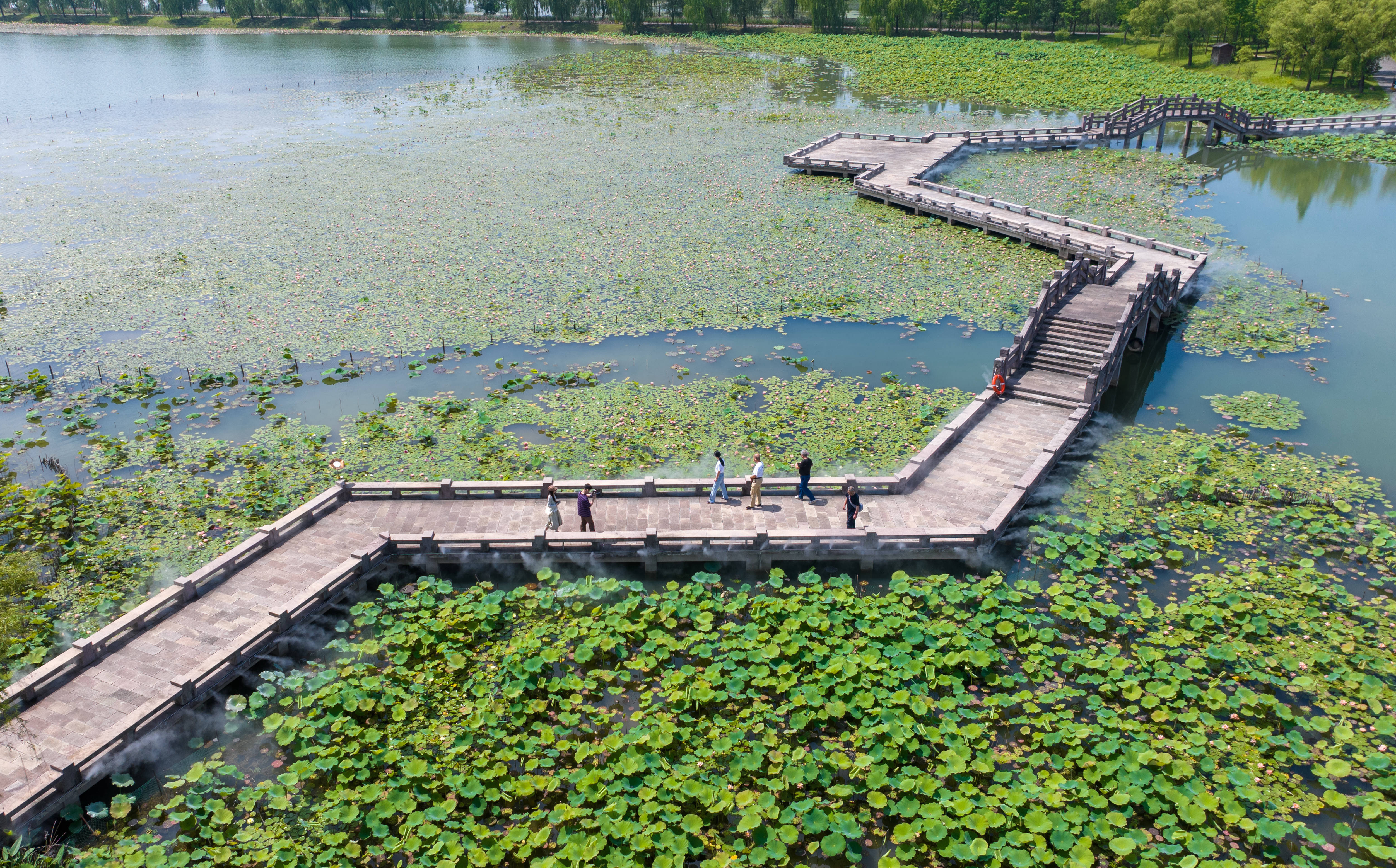 近日,随着各地气温的升高,城市里的湿地公园、湖岸水畔,成为人们乘凉避暑的好去处。亭台与小桥错落有致,碧水与莲花相映成趣,形成一幅美好的夏日画卷。