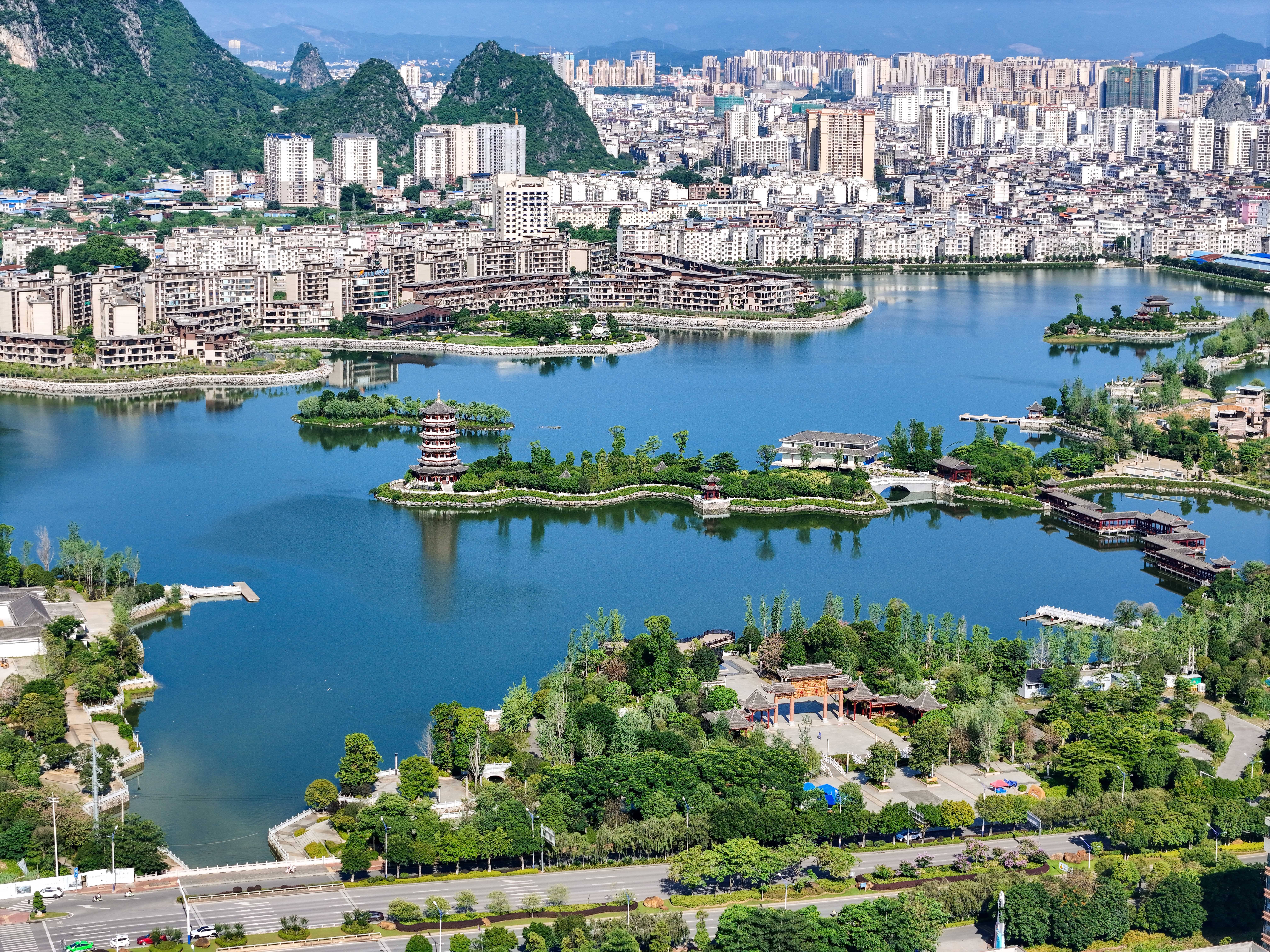 ↑2025年6月7日在广西壮族自治区贺州市永丰湖湿地公园拍摄的风景。(无人机照片)CICPHOTO/黎豪图 摄
